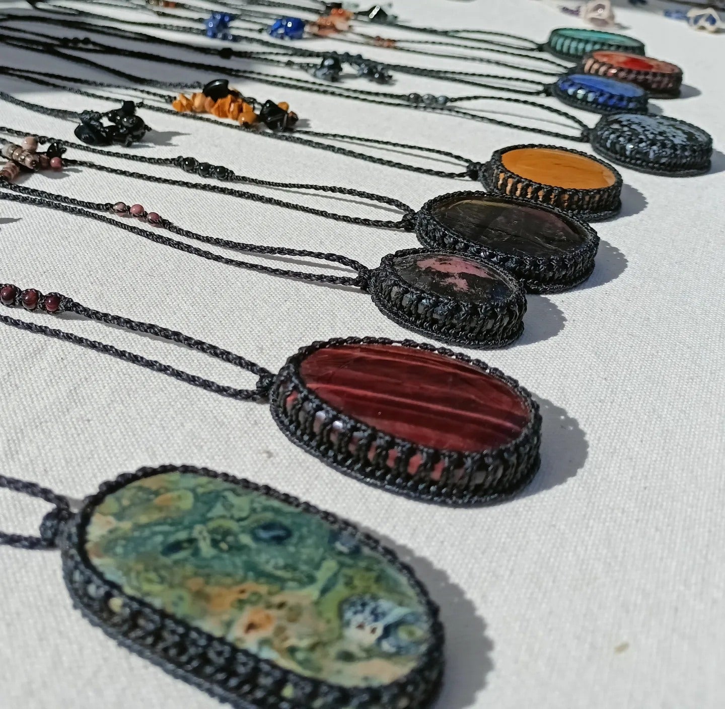 Je sélectionne chaque pierre avec soin, les purifie et les recharge avant de les sublimer avec un tissage de haute qualité. J'utilise la technique du macramé qui consiste à réaliser une succession de petits nœuds. Ce tissage entièrement fait à la main, sans autre outils, demande patience et précision: petit à petit, les nœuds s'enchainent et s'alternent, l'histoire s'écrit, le bijou prend forme... La conception d'un bijou peut prendre quelques heures à plusieurs jours. C'est un travail minutieux, méditatif, qui me plonge dans la simplicité de l'instant.